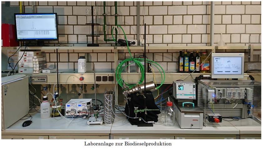 in der in kontinierlicher Betriebsweise gewerbliches Rapsöl und Methanol mit Kaliumhydroxid als basischem homogenen Katalysator umgesetzt werden.
