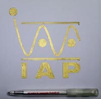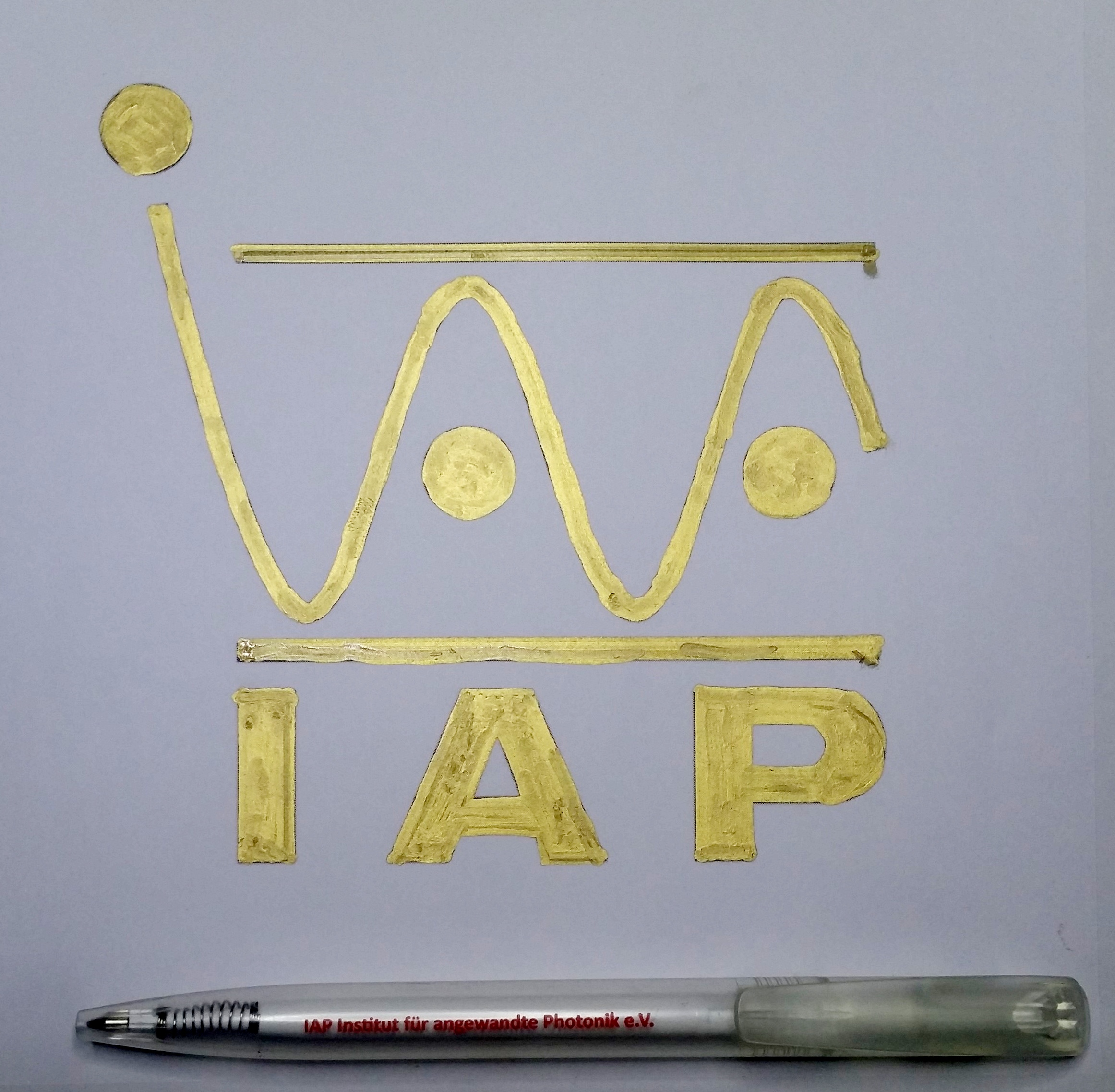 das IAP-Logo auf Papier gebracht – Kugelschreiber als Größenvergleich.