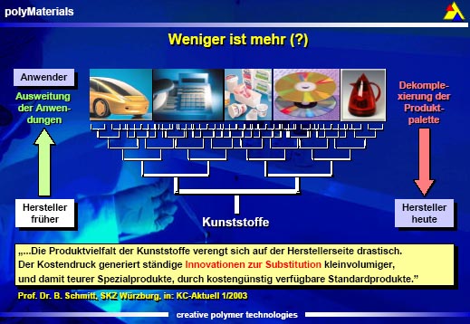 .. die Folgen für den Kunststoffanwender sind, das anwender- und anwendungs-spezifische Kunststoffe reduziert bzw. ganz eingestellt werden. Spezialitäten werden den Distributeuren übertragen.