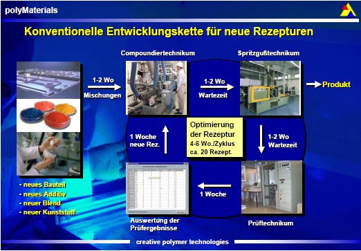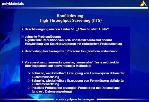 Die konventionelle Entwicklung neuer Rezepturen erfordert ca. 4-6 Wochen für 20 Rezepturen. Mit HTS sollen und können ca. 400 Rezepturen pro Woche entwickelt werden.