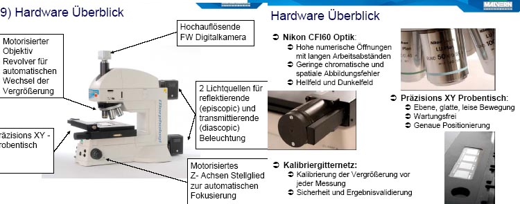 Feinmechanik, Beobachtungsoptik, Beleuchtung, Objekttisch und Bildregistrierung sind die qualitätsbestimmenden Komponenten bei der Bilderzeugung,