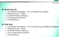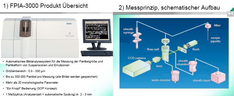 - das Bildanalysesystem FPIA 3000 (Messbereich 0,8 - 300 mm) für den Einsatz in Flüssigkeiten.