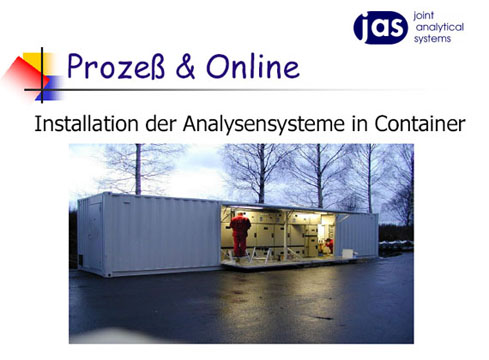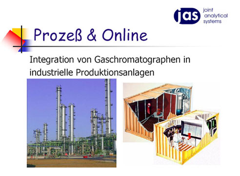 Joint Analytical Systems (JAS) liefert vornehmlich in Container eingebaute Gaschromatographen, um eine direkte Integration in die Produktionsanlagen und den Online-Betrieb zu ermöglichen.