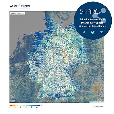 steht ein Online-Tool mit großer Bildschärfe: "Für den Wasser-Monitor werden 60 Millionen Gitterpunkte berechnet", erklärt Dr. Alexandre Belleflamme aus dem Team des ADAPTER-Projektes. Auf einer interaktiven Karte zeigt das Webinterface für ganz Deutschland das für Pflanzen verfügbare Wasser bis in eine Tiefe von 30 Zentimetern an. Über eine Such- und eine Zoomfunktion ist es möglich, die Karte bis auf die Ebene einzelner Ortschaften zu vergrößern. Zusätzlich bietet die Website zwei Videoanimationen. Sie zeigen, wie sich das pflanzenverfügbare Wasser in Deutschland und speziell in Nordrhein-Westfalen im zeitlichen Verlauf ändert. |