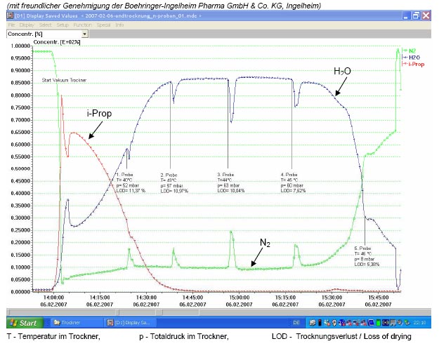 Trocknungsprozesses kann, nach einer einmalig zu ermittelnden Korrelation zu den Trocknungsverlust-Werten, anhand der massenspektrometrischen Daten ohne Zeitverzögerung erkannt