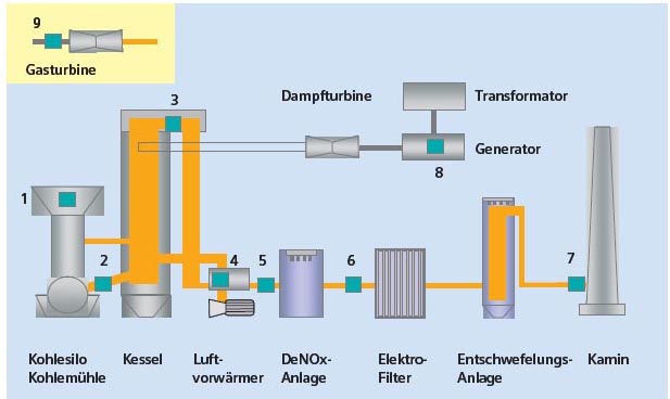 | Typische Messstellen der Prozessanalytik in einem Kohlekraftwerk |