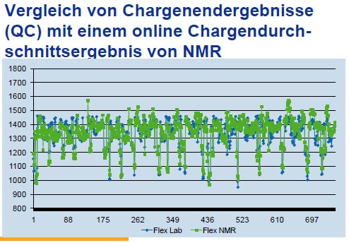 Die hohe Informationsdichte bei NMR-Analysen (grüne Punkte im nebenstehendem Diagramm) im Vergleich zu den üblichen QC Methoden (blaue Punkte) ist der entscheidende Vorteil der Online-Polymeranalytik. |