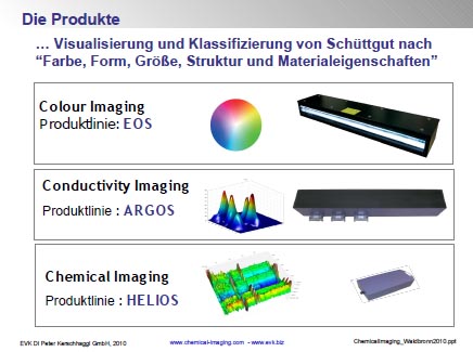 Chemische Materialeigenschaften werden hierfür mit Hyperspetral Imaging Kamerasystemen (Chemical Imaging) der Produktfamilie HELIOS inline erhoben, multivariat verarbeitet und klassifiziert.