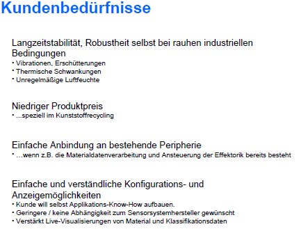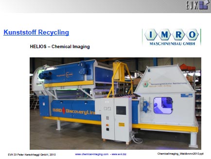 am Beispiel des Kunststoffrecyclings diskutiert. Vorteile und Nachteile werden alternativen Sensortechnologien gegeübergestellt. Eine Beschreibung des Weges von der Aufnahme der Daten über verschiedene Korrekturmaßnahmen bis hin zum gut aufbereiteten Spektrum, zeigt die Notwendigkeit einer leistungsstarken Recheneinheit auf.