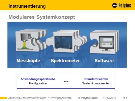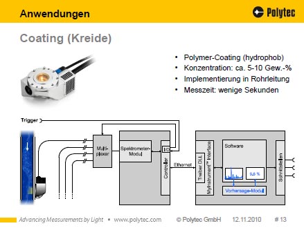 Ein Diodenzeilenspektrometer ist über fasergekoppelte Sensorköpfe in die Messstelle integriert, wobei die Messung im Kontaktverfahren (Messabstand weniger als 20 mm) in diffuser Reflexion stattfindet.