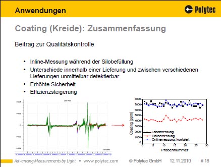 | Das Beispiel zeigt die quantitative Bestimmung eines Coatings auf Kreideproben unmittelbar nach dem Verlassen des Silos. |