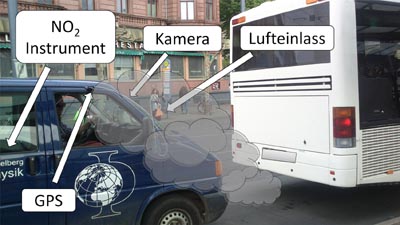 Bei den Untersuchungen ist das Instrument in einem Fahrzeug installiert, so dass die Konzentration von NO2 in den Abgasfahnen von PKWs, Bussen, LKWs oder Zweirädern während der Fahrt gemessen werden kann.