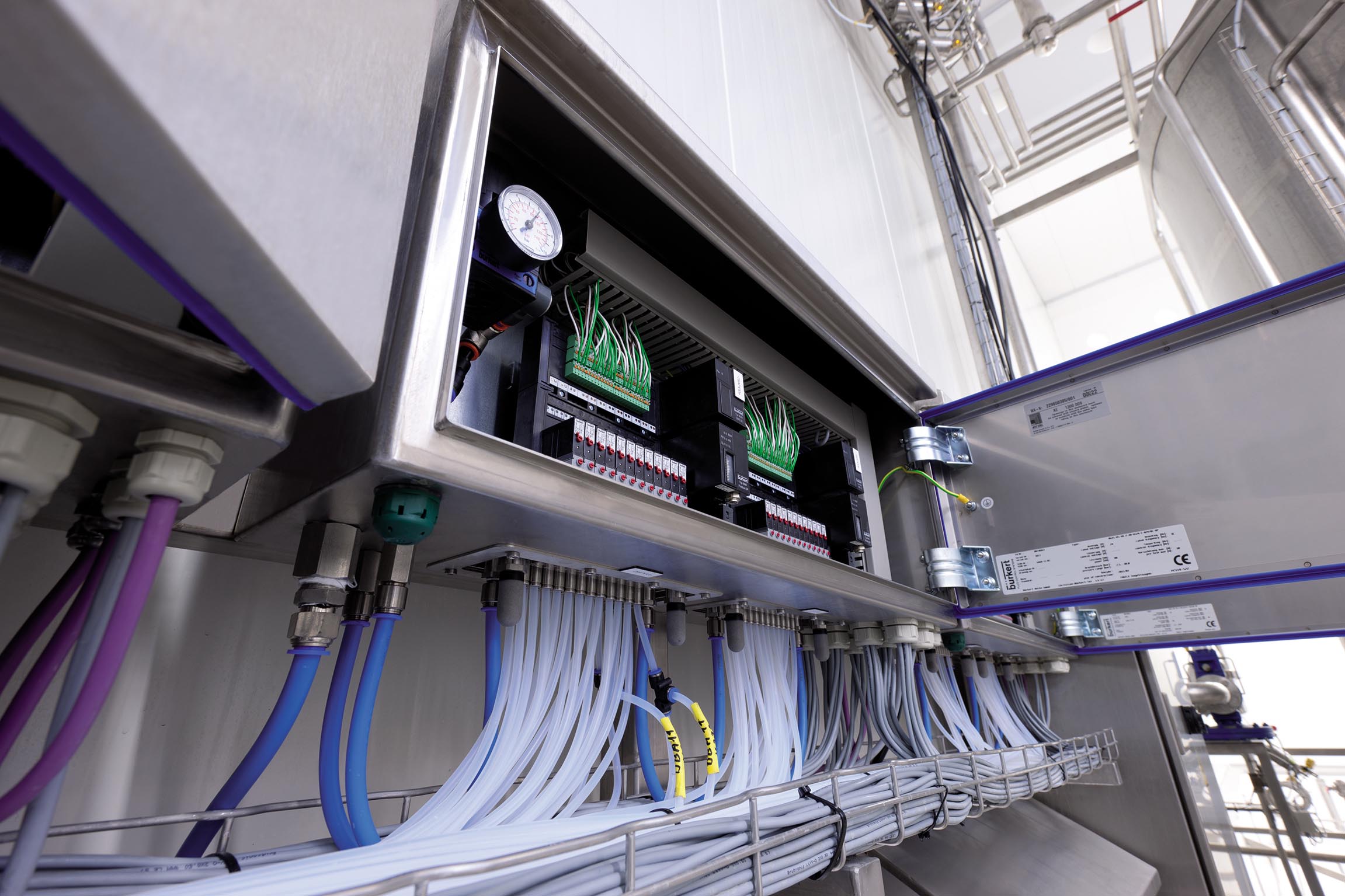 Die AirLINE Quick Ventilinseln werden dabei im Hygienic Design Schaltschrank komplett vorverdrahtet, ebenso wie alle sonstigen Bauteile im Schaltschrank. Die Installation erfolgt in unmittelbarer Nähe zu den Ventilen, mitten im hygienesensiblen Prozessumfeld. Das spart Material- und Installationsaufwand und erleichtert die Reinigung.