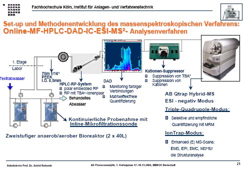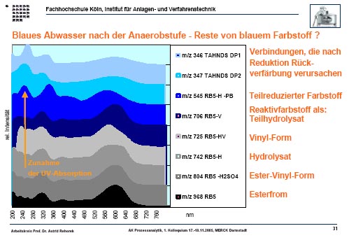 Die biologische Behandlung von unerwünschter Farbe erfordert ein komplexes Analysenverfahren mit verschiedenen Kopplungstechniken. Hierbei sollte die Struktur der Azofarbstoffe aufgeklärt werden.