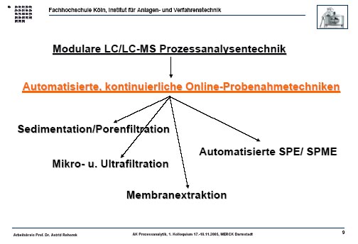 Vorgestellt werden Beispiele moderner LC/LC-MS-Verfahren zum kontinuierlichen Prozessmonitoring aus verschiedenen Bereichen von Fermentern, Bioreaktoren und Kläranlagen. Es werden sowohl Mehrkomponenten-Prozess-Analysatoren der Prozess-Flüssigchromatographie als auch der Prozess-Massenspektrometrie erfasst.