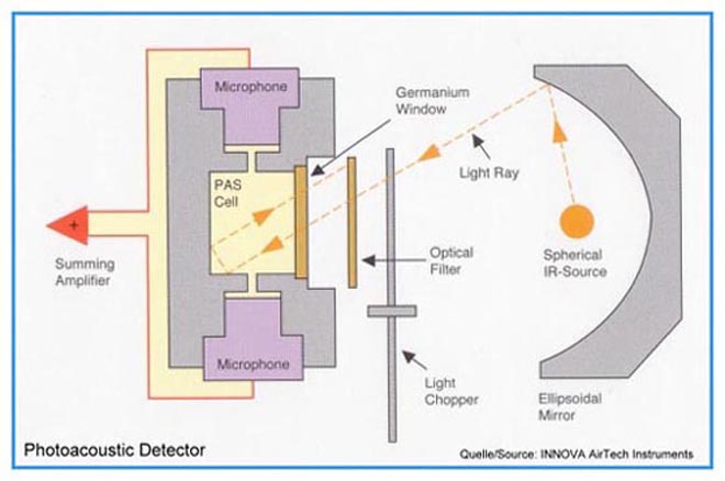 Ein Spiegel (Ellipsoid) fokussiert das IR-Licht in das Germanium-Fenster der PAS-Messzelle. Auf seinem Wege passiert es einen Chopper und ein optisches Filter .